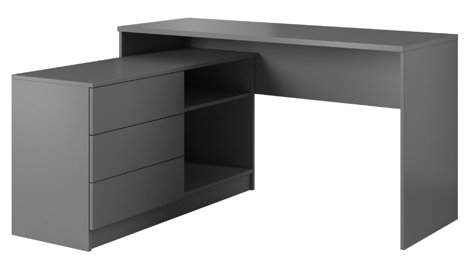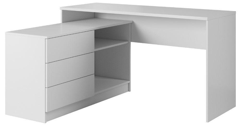Biurko Tytus to prosty funkcjonalny pomysł na stworzenie wygodnego miejsca do pracy i nauki. Biurko wykonane w kształcie litery L. Posiada szafkę, składającą się z trzech szuflad z systemem otwierania PUSH TO OPEN, a także wnękę z półką, która pomoże w organizacji miejsca pracy. Ten element jest uniwersalny, co oznacza, iż można go zamontować zarówno po prawej, jak i lewej stronie.