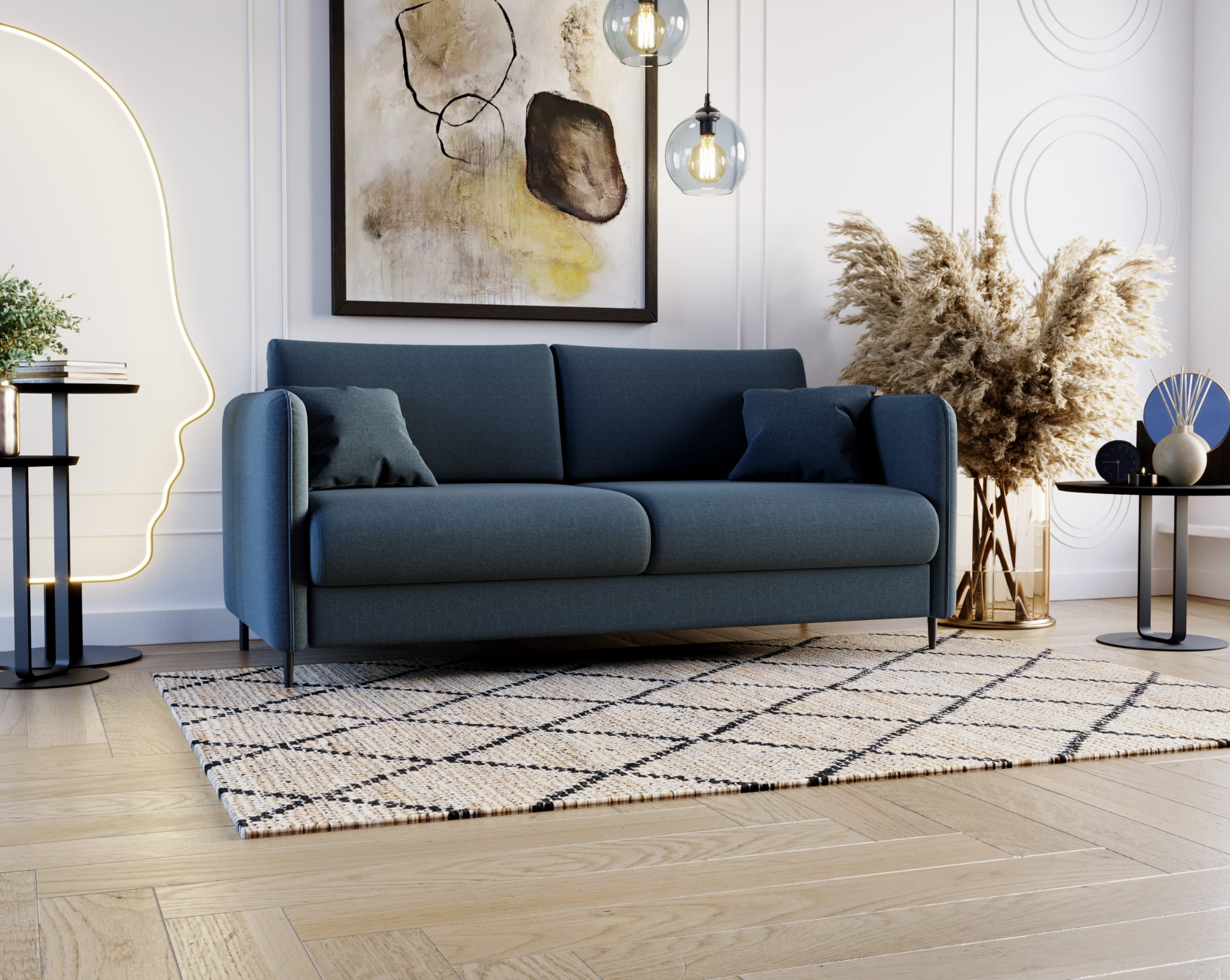 Nowoczesna kanapa Sky II zachwyca swoją funkcjonalnością. Za dnia będzie praktycznym i komfortowym meblem wypoczynkowym, a nocą wygodnym łóżkiem. Kanapa jest idealnym rozwiązaniem dla mieszkań o małej powierzchni. Sofę rozłożysz za pomocą jednego pociągnięcia oparcia i siedziska, dzięki systemowi włoskiemu. Cała konstrukcja oparta jest na metalowych nóżkach. Cały mechanizm jest dziecinnie prosty w rozkładaniu, dzięki czemu urządzisz mały pokój nastolatka, niewielki salon, który pełni funkcję sypialni.