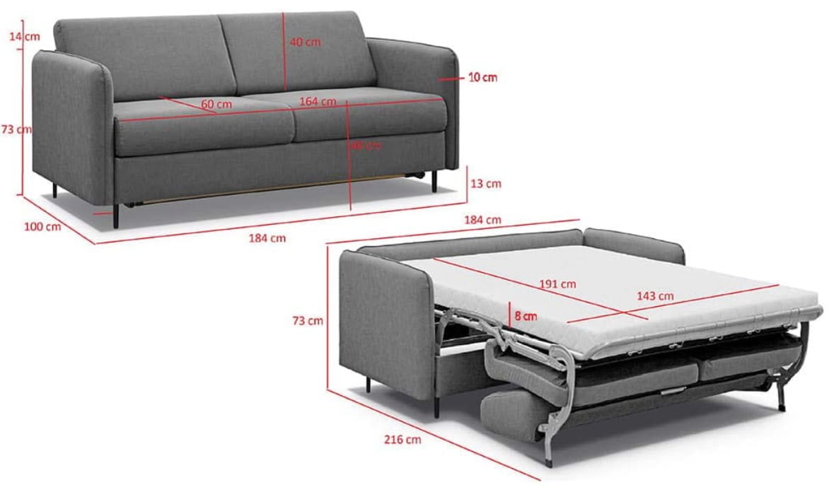 Kanapa oparta jest na systemie włoskim, więc jej metalowy stelaż rozkłada się na jednym pociągnięciem oparcia i siedziska. Wszystkie elementy systemu są ze sobą zintegrowane, więc nie potrzeba żadnych dodatkowych części, chowania materaca czy poduszek. Kanapa osiąga powierzchnię spania o wymiarach aż 140x195 cm, co daje optymalną ilość miejsca do spania dla 2 osób. Cały mechanizm jest dziecinnie prosty w rozkładaniu.