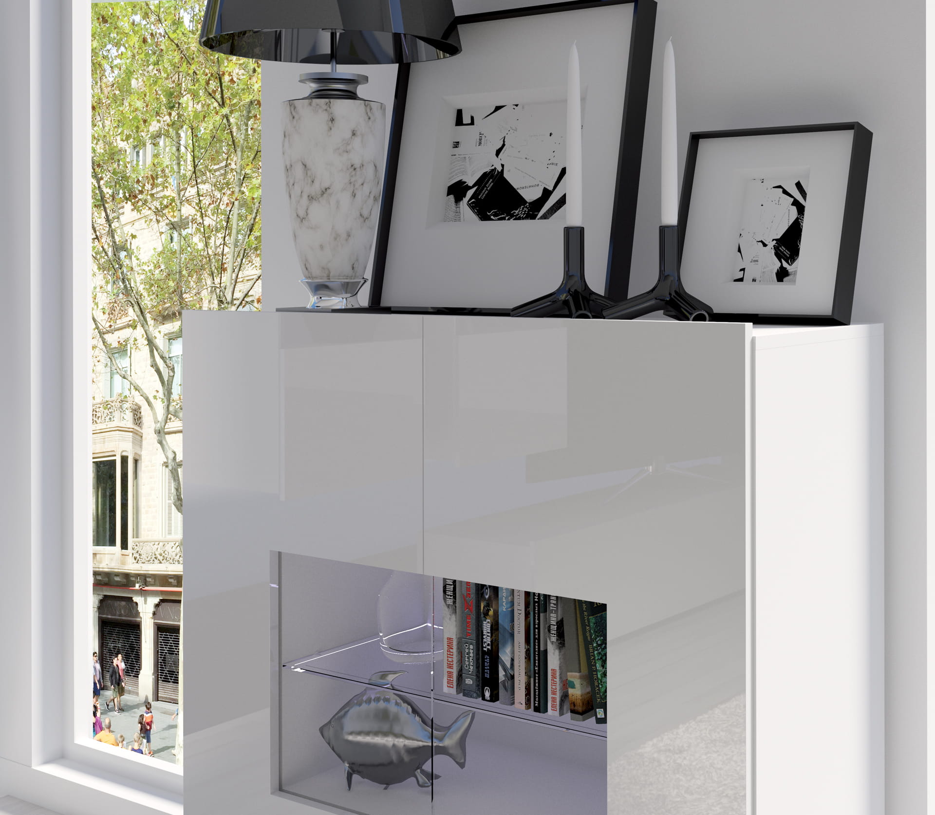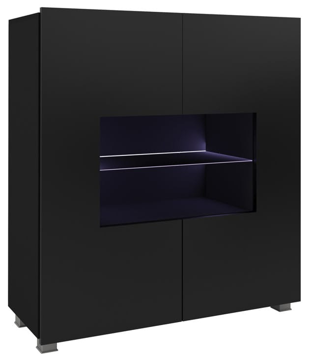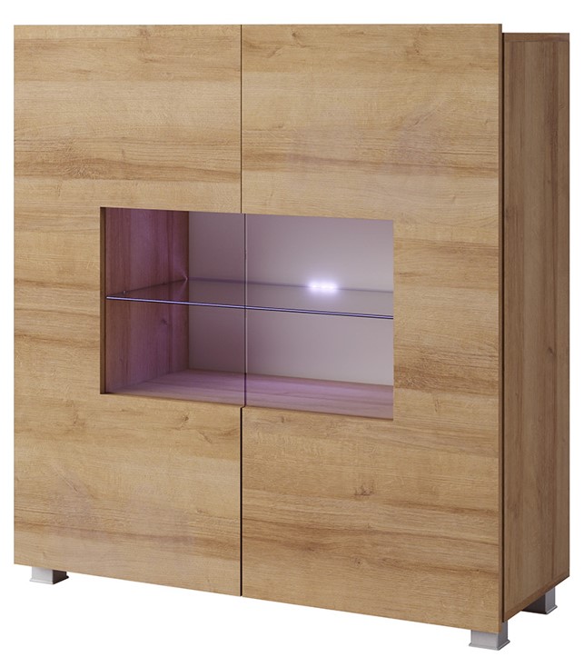 Komoda 2D Cindy C02 posiada zamykane do boku szafki oraz jedną oszkloną półkę. Pozwala to na przechowanie różnych rzeczy czy akcesorii domowych.