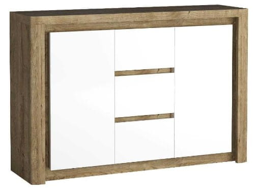 Nowatorska komoda z trzema szufladami w środkowej części i dwoma szafkami. Komoda jest bardzo duża i pojemna. Doskonale pasować będzie do sypialni czy pokoju dziecięcego. Zastosowane w niej zawiasy i prowadnice z cichym domykiem nie spowodują, ze musisz martwić się czy kogoś nie obudzisz. Każda z szaf ma po jednej półce, dzięki czemu zyskujemy miejsce do przechowywania. Komoda w zestawie ma oświetlenie, które wieczorem umili relaks przy naturalnej, ciepłej barwie LEDów.
