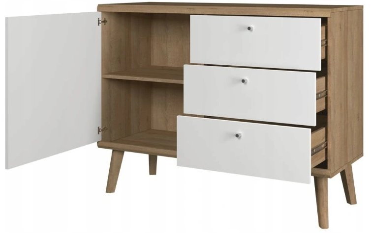 Komoda PORTO posiada drzwi uchylne, za którymi kryje się półka przedzielająca wnętrze na dwie części. Trzy wysuwane szafki pozwolą na przechowywanie mniejszych przedmiotów. Blat w kolorze dębu, będzie świetnie wyglądał z pozostałymi elementami aranżacji.