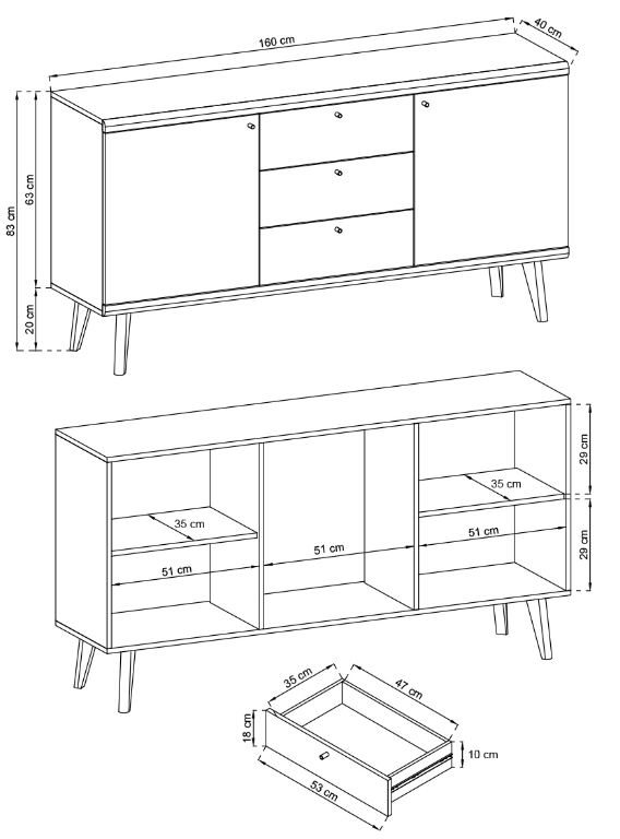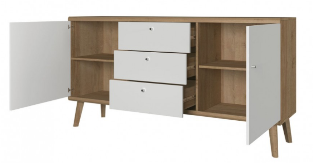 Komoda PORTO posiada parę drzwi uchylnych, za którymi kryją się dwie półki przedzielone ścianką. Trzy wysuwane szafki pozwolą na przechowywanie mniejszych przedmiotów.