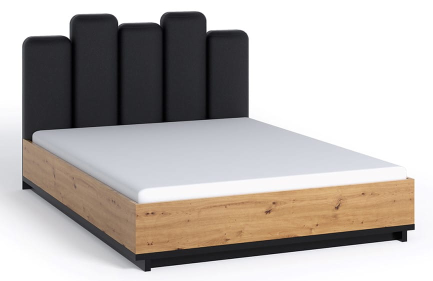 Łóżko z tapicerowanym zagłówkiem 160x200 Ines IN05 wyposażone zostało w pojemnik na pościel, stelaż oraz tapicerowany zagłówek. Ciepła kolorystyka naturalnego drewna oraz oryginalny design łóżka sprawi, że w Twojej sypialni zapanuje atmosfera relaksu i spokoju, dzięki czemu z łatwością wypoczniesz po ciężkim dniu.