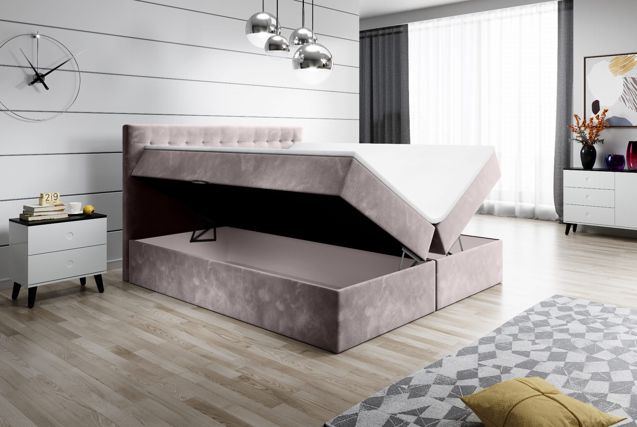 Pojemnik na pościel pomoże uporządkować przestrzeń w sypialni. Podnośniki sprężynowe pomagają otwierać i zamykać pojemnik. Estetyczne białe wykończenie wnętrza skrzyni podkreśla dbałość o szczegóły.