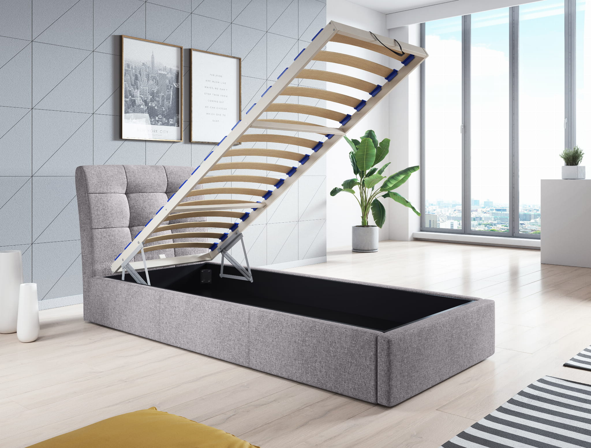 Łóżko posiada pojemnik na pościel oraz otwierany stelaż elastyczny (16 listwowy) na ramie drewnianej. Otwieranie i zamykanie pojemnika przy pomocy podnośników sprężynowych.