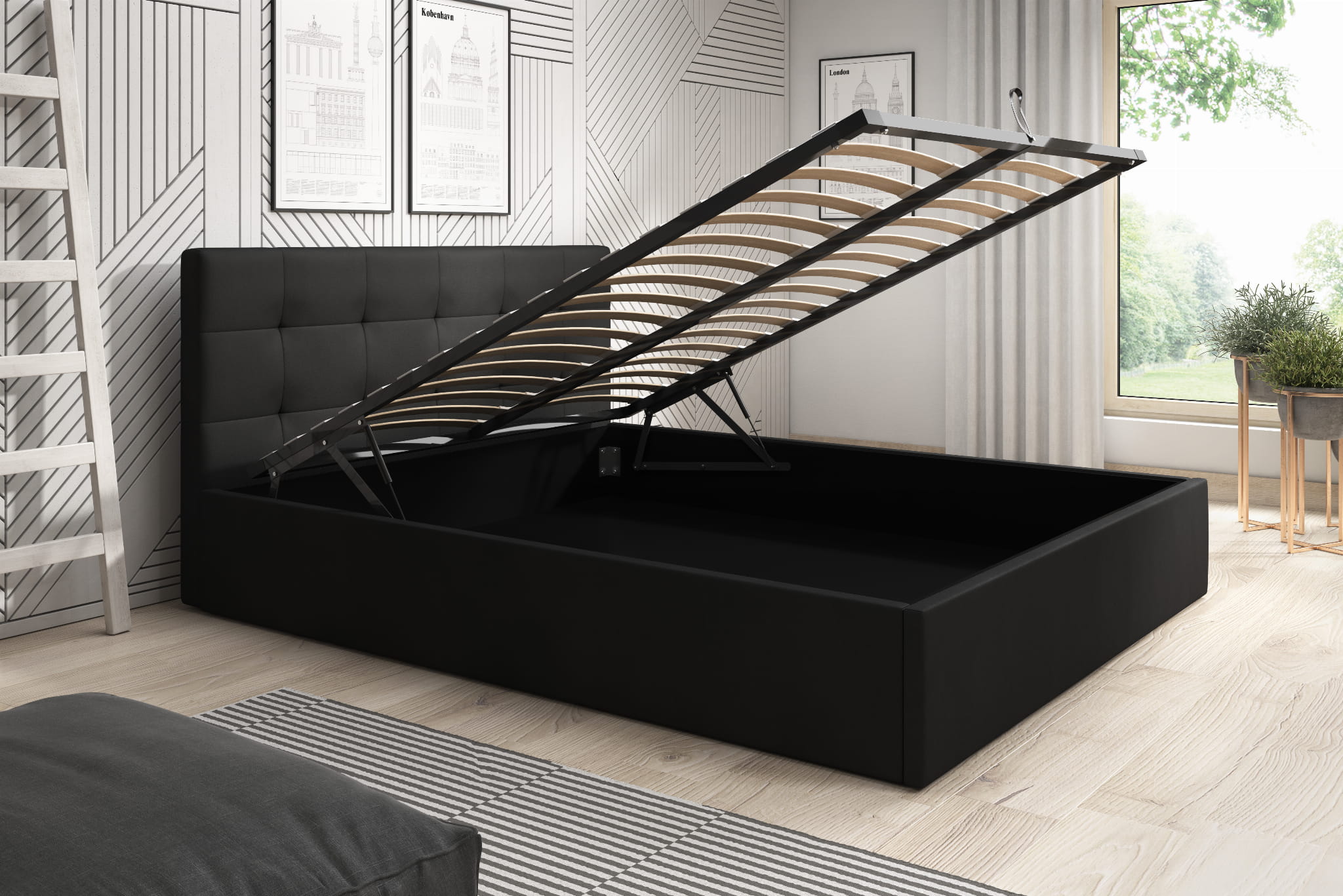 Pojemnik na pościel ze stelażem wykonany na drewnianej ramie, za podnoszenie i opuszczanie pojemnika odpowiadają podnośniki sprężynowe, solidne i sprawdzone rozwiązanie.