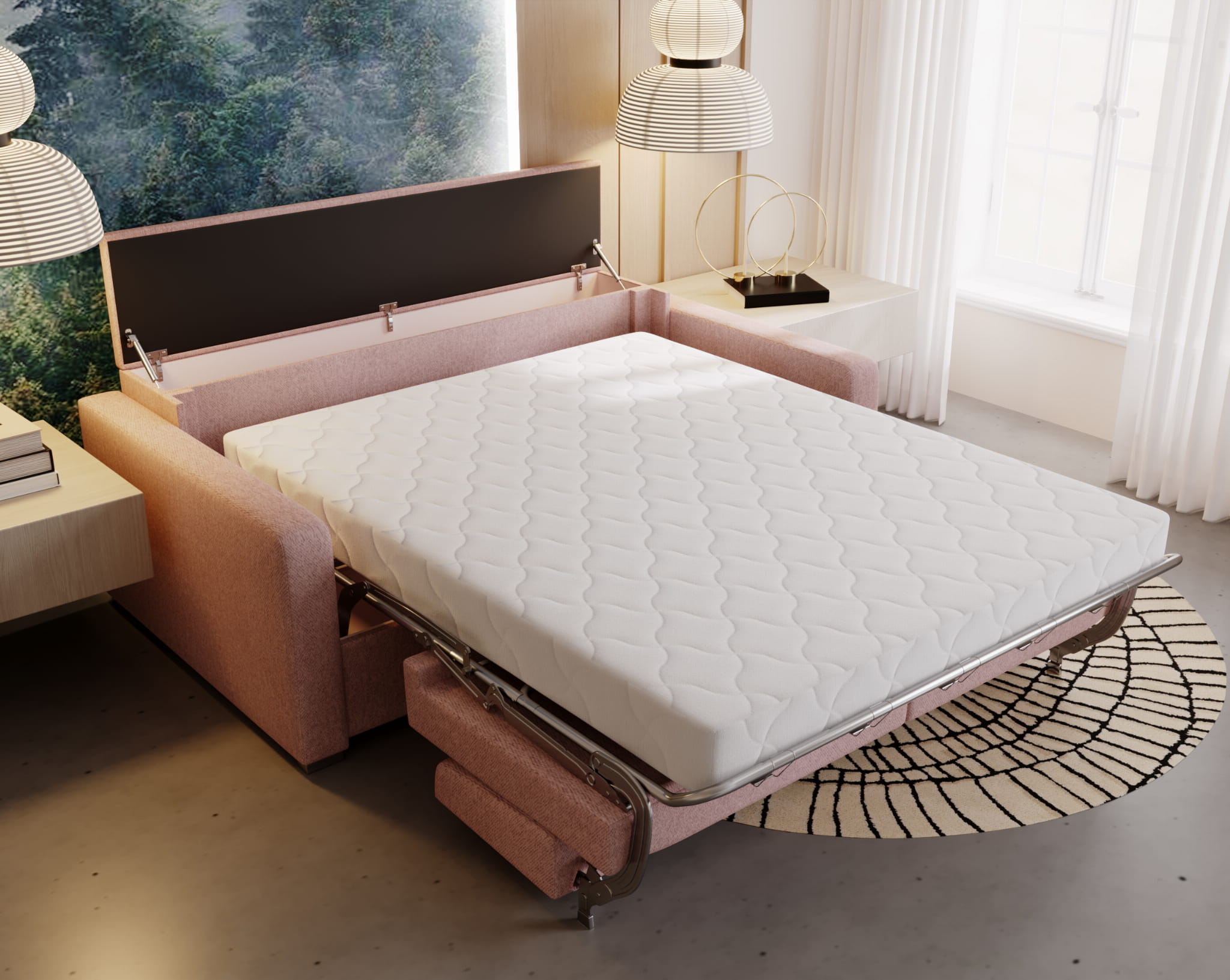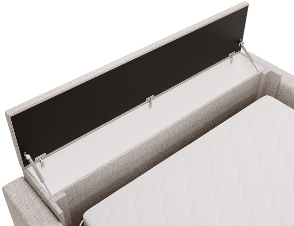 Warto docenić ogromną korzyść w postaci pojemnego schowka na pościel, umieszczonego z tyłu sofy. To idealne rozwiązanie na przechowywanie kołder, poduszek czy pościeli, które nie tylko oszczędza miejsce, ale również pomaga utrzymać porządek. Dzięki grubemu, 9-centymetrowemu materacowi piankowemu, może pełnić rolę zarówno codziennego, jak i okazjonalnego łóżka do spania.