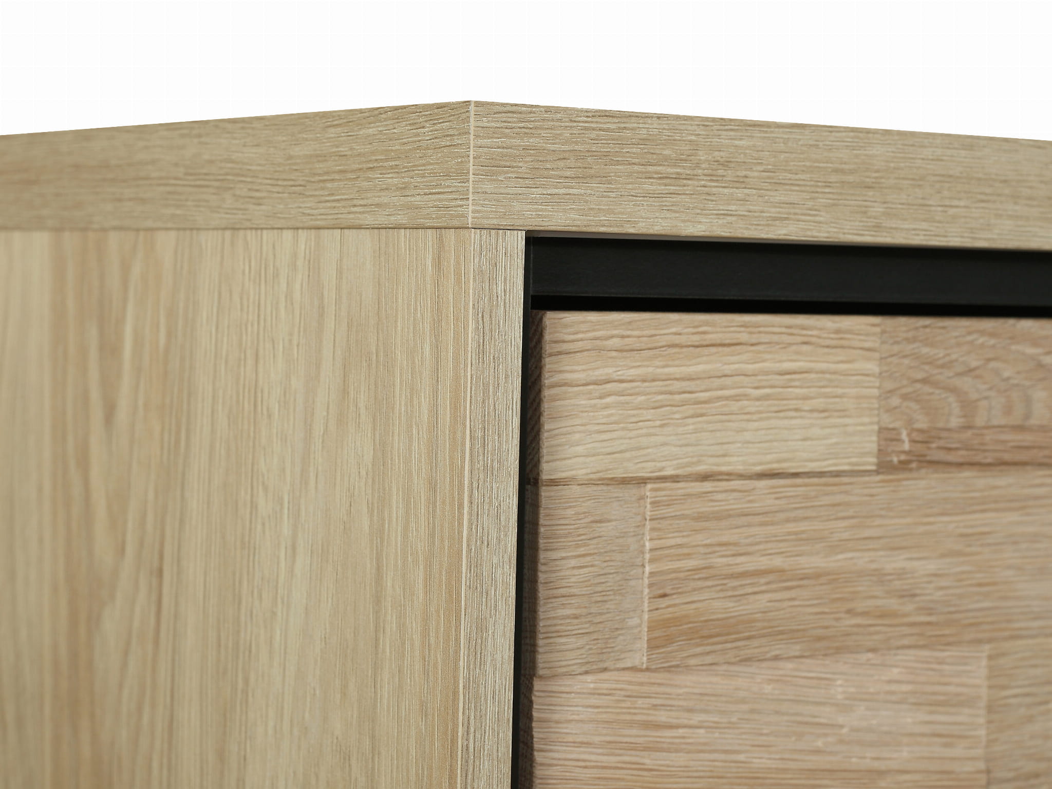 Fronty szuflad zasługują tu na uwagę – wykonane z drewna dębowego z charakterystycznym łupanym wzorem.