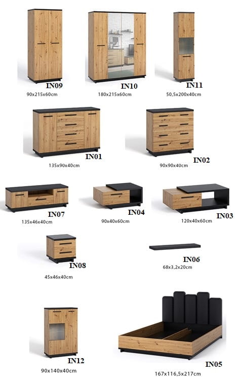 Meble Ines zostały zaprojektowane zarówno z myślą o sypialni, jak i pokoju dziennym. Elementami charakterystycznymi systemu Ines są cokoły stanowiące podstawę mebli oraz grube, czarne blaty.