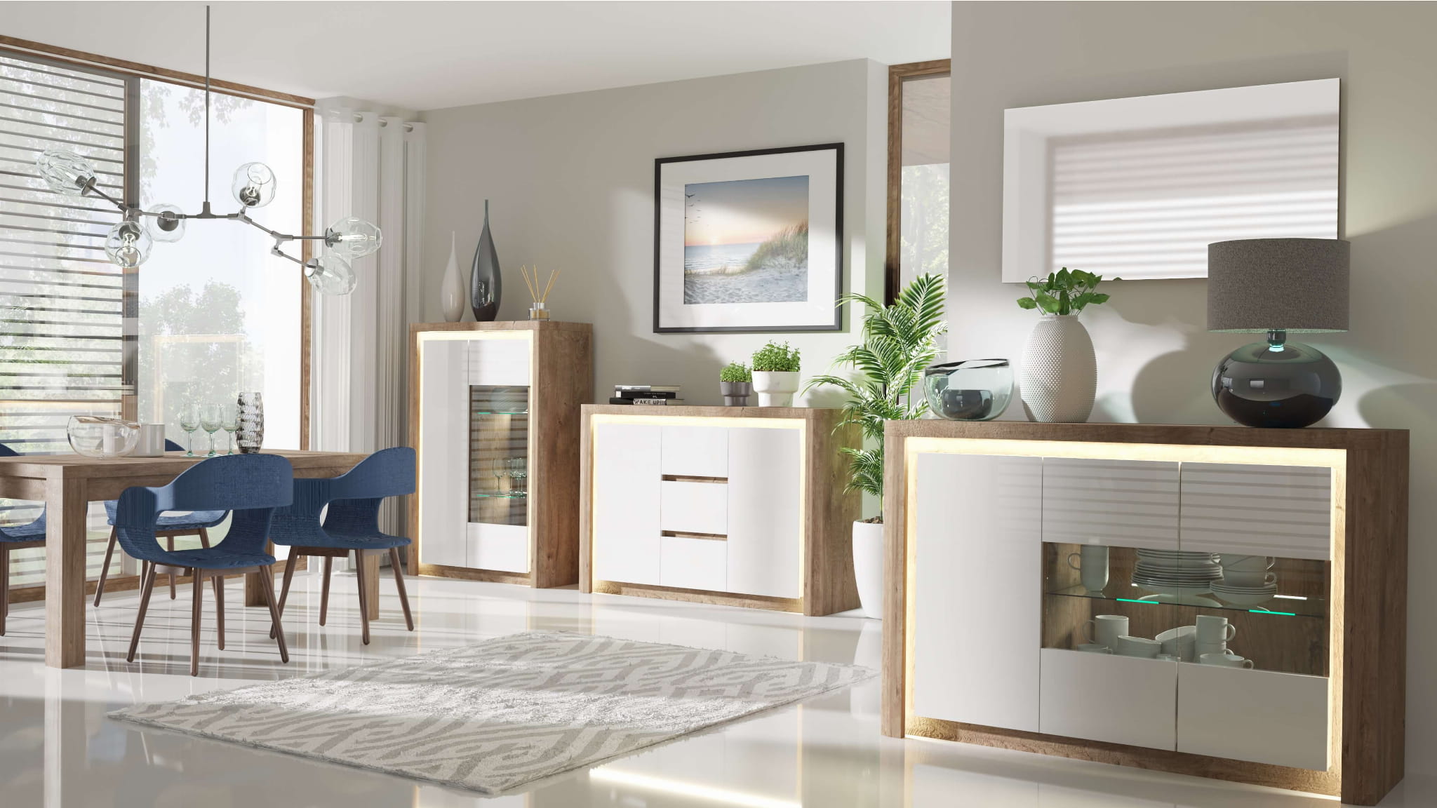 Nowoczesny system z modnym ledowym podświetleniem w komodach i witrynach. Oświetlony został blat górny, jak i boki mebli, dzięki czemu w pomieszczeniu stworzymy ciepłą i miłą atmosferę. Naturalny kolor ribbeck w połączeniu z białymi frontami w połysku to idealne połączenie do salonu, pokoju czy jadalni.