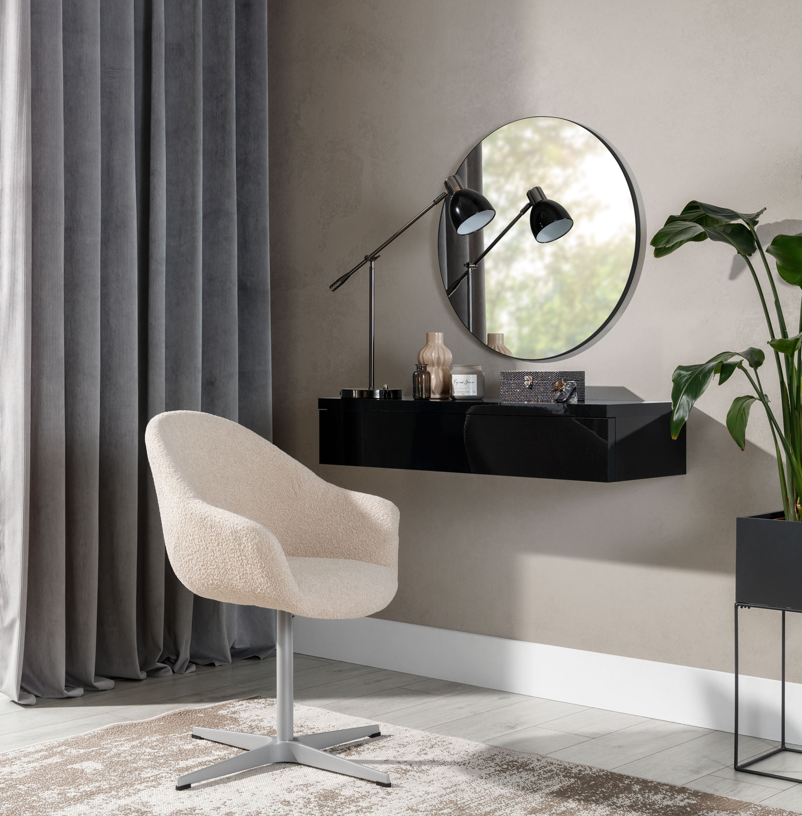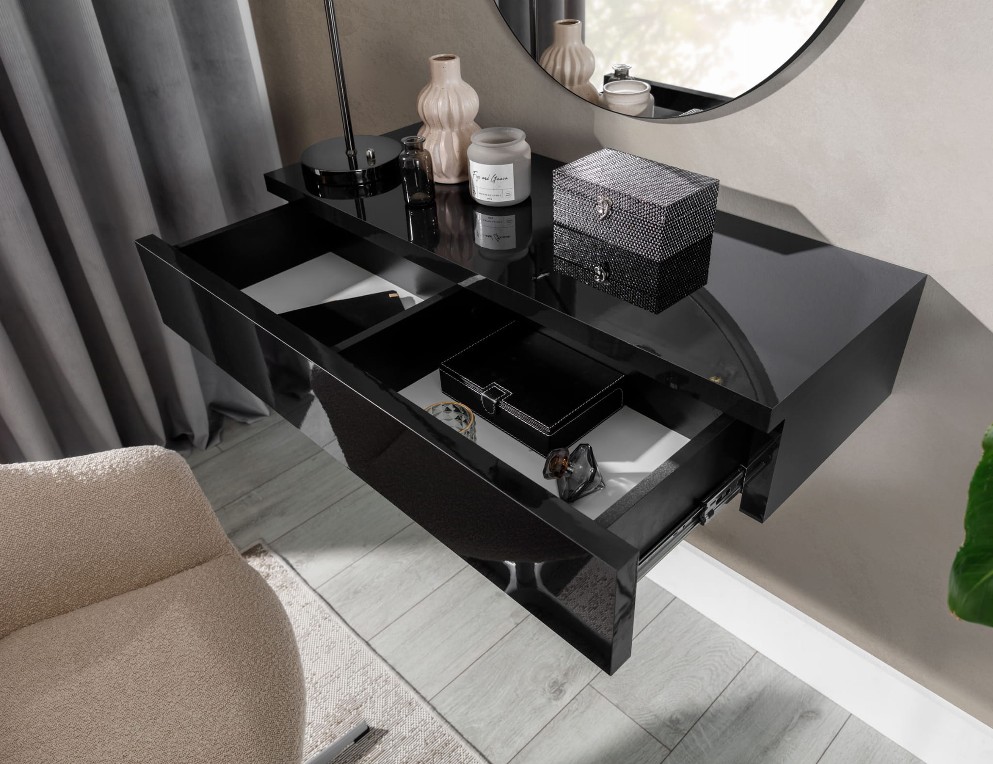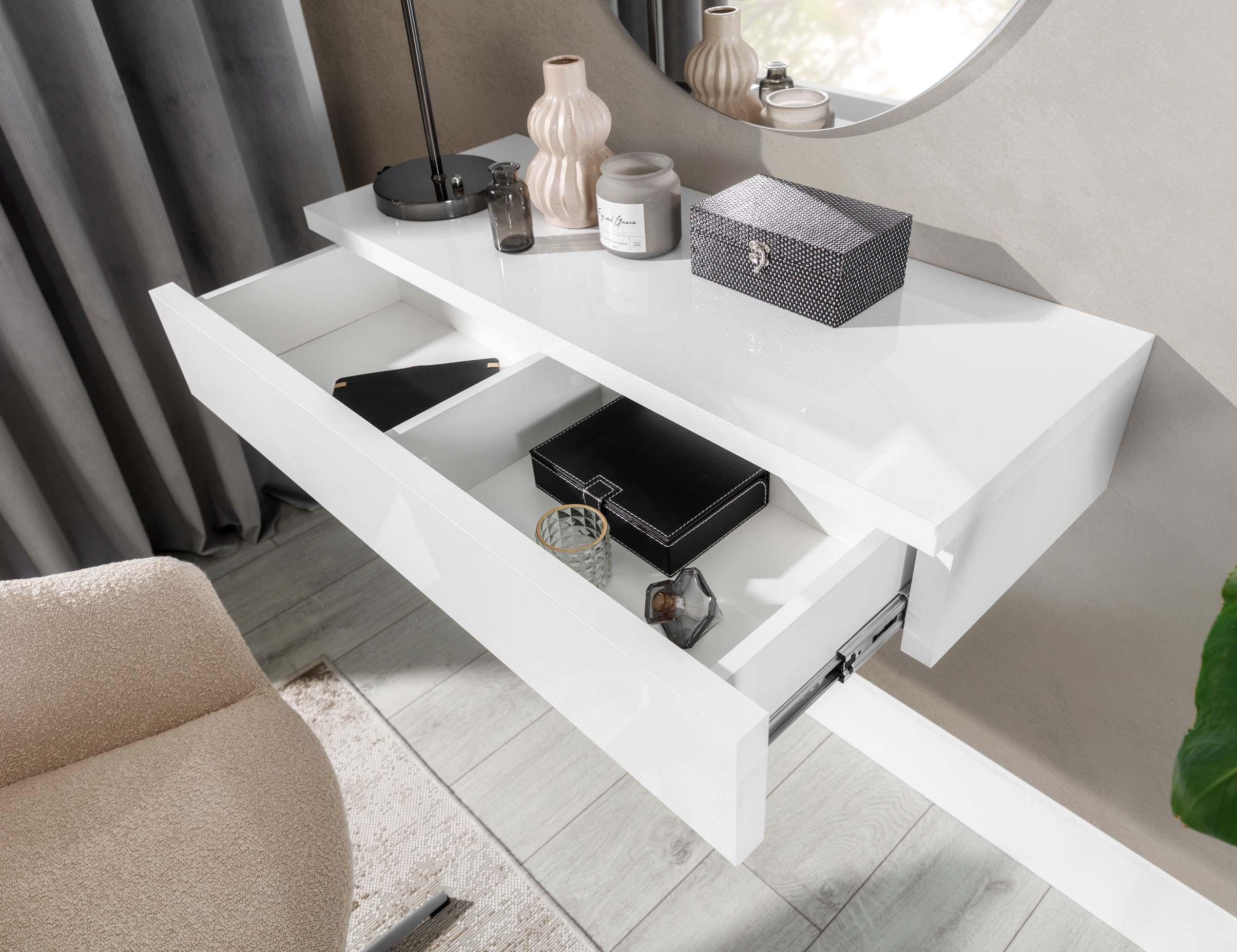 Kolekcja Navene to znakomite połączenie nowoczesnego stylu i subtelnej elegancji, które nada Twojemu wnętrzu wyjątkowego charakteru. Ta efektowna, minimalistyczna toaletka doskonale wkomponuje się w różnorodne aranżacje. Praktyczna szuflada pozwoli na utrzymanie porządku i łatwe przechowywanie akcesoriów kosmetycznych.