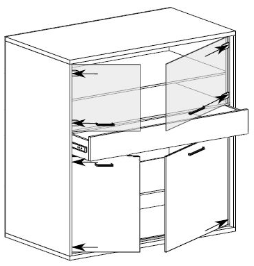 - w komodach, witrynach oraz szafach blaty górne z płyty laminowanej o grubości 32 mm