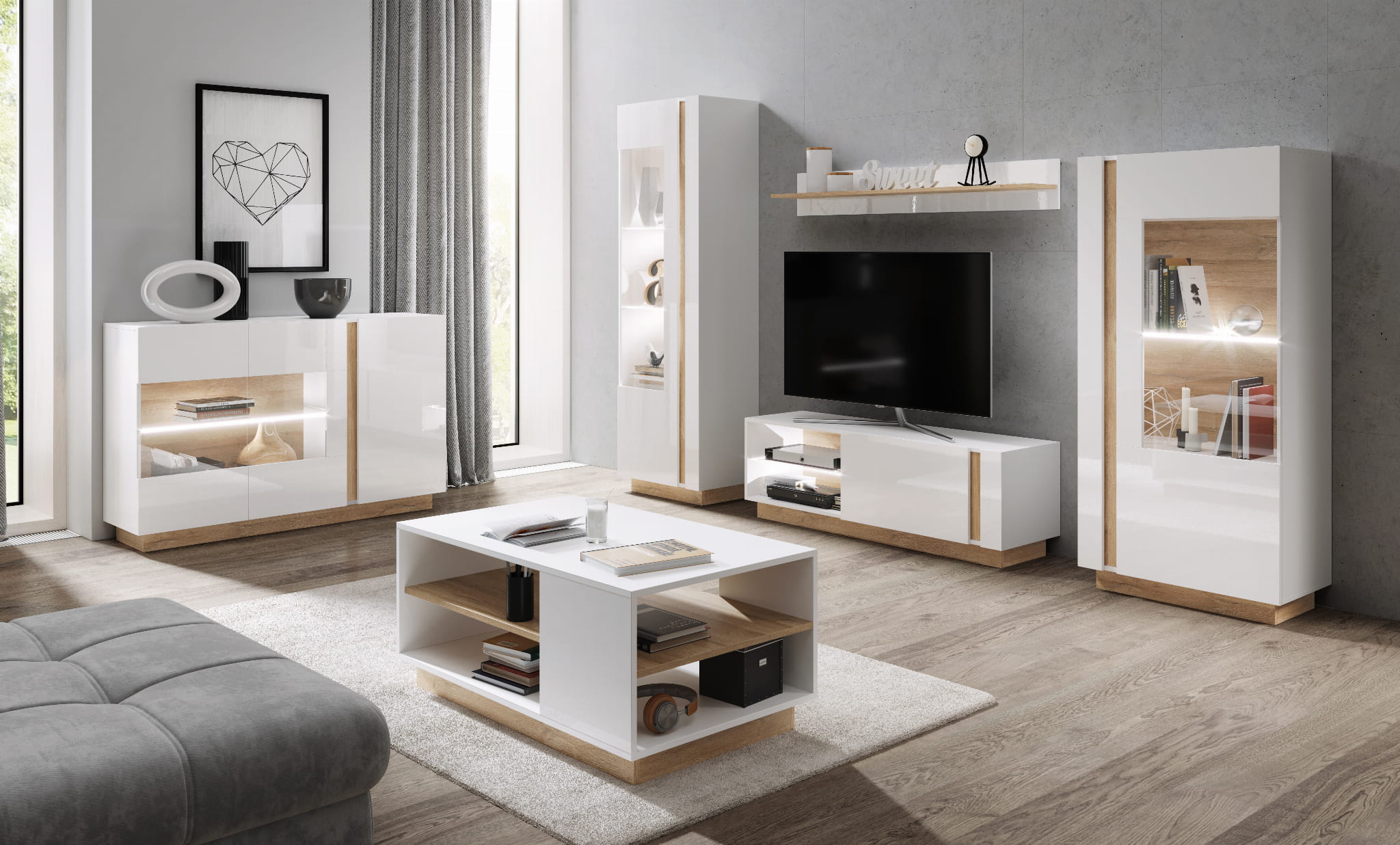 Kolekcja mebli Aron to propozycja dla osób ceniących funkcjonalność, elegancję oraz nowoczesność w minimalistycznej stylistyce. System Aron świetnie sprawdzi się w nowocześnie zaaranżowanym salonie oraz sypialni. Biały połysk na frontach z nutą szlachetnego dębu grandson sprawią, że Twoje wnętrze nabierze niepowtarzalnego i oryginalnego wyglądu. System Aron składa się z wielu elementów, które można łączyć dowolnie według własnych potrzeb.