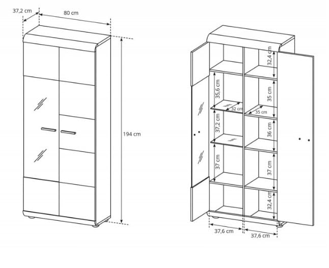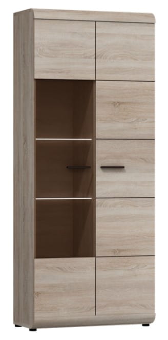 Witryna wysoka 80 Line posiada dużo miejsca do przechowywania. Komoda ma osiem półek, dwie z nich są przeszklone i mogą być oświetlone. Na szczególną uwagę zasługuje możliwość montażu witryny w wariancie lewym, jak i prawym. Można zatem dopasować jej ostateczny wygląd do własnych upodobań, planowanej aranżacji i możliwości pomieszczenia.
