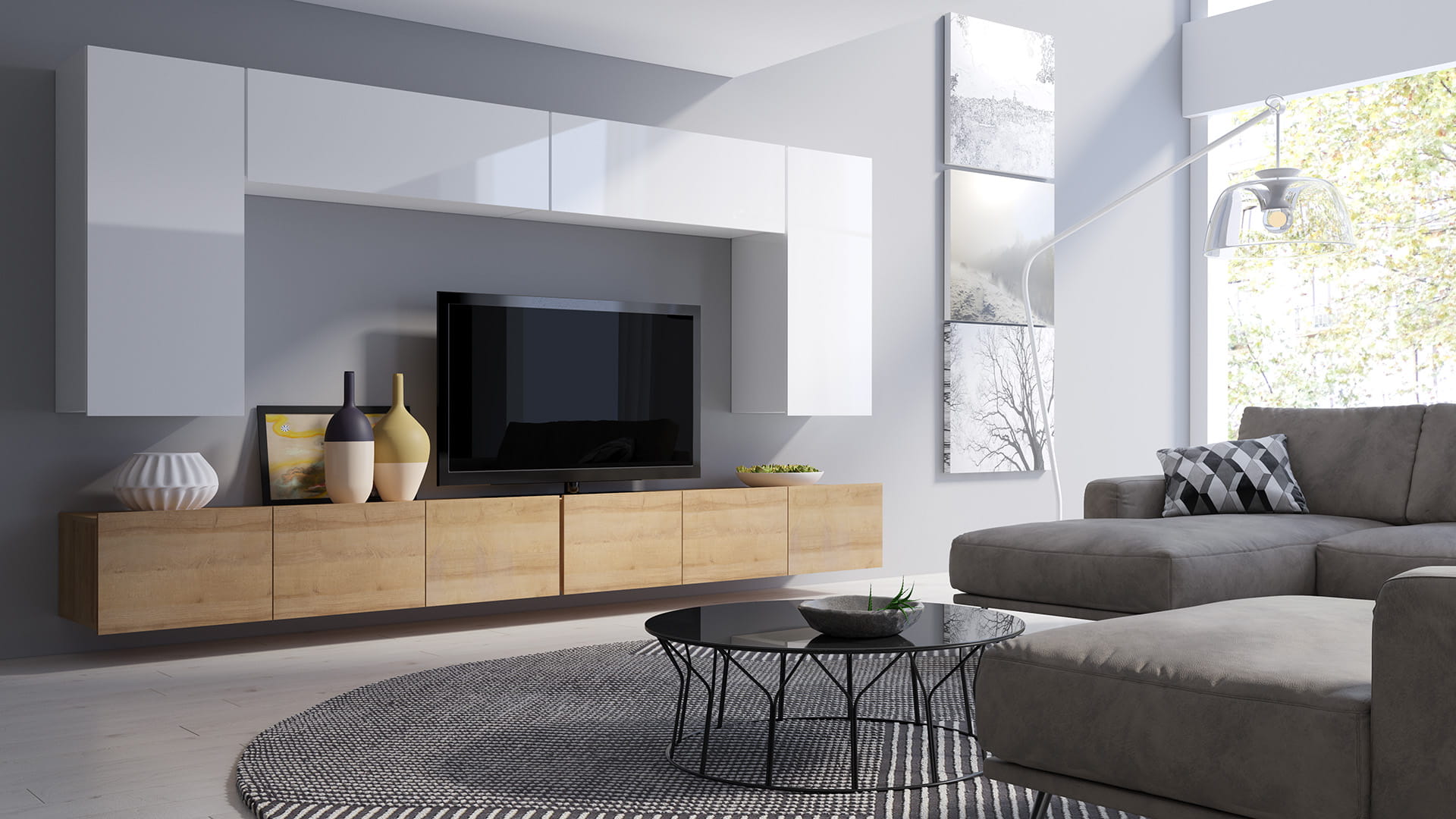Meble systemowe Cindy to idealny sposób na wyróżnienie wyjątkowego charakteru Twojego salonu lub pokoju dziennego. Meble Cindy to inspirowane meble które łączą minimalizm, nowoczesność i elegancję w jednym. Mimo niewielkiej ilości elementów nasi klienci mogą tworzyć ciekawe aranżacje. Do wyboru trzy wersje kolorystyczne: biały połysk, czarny połysk i dąb złoty.