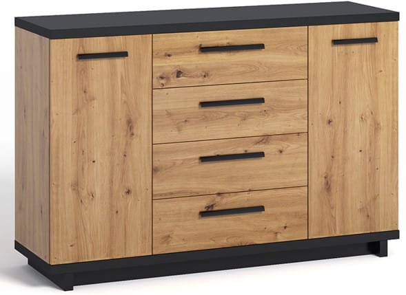 Komoda 2D4SZ Ines IN01 wyposażona została w 4 praktyczne szuflady i zamykane po bokach szafki z półkami wewnątrz. Dzięki takiemu rozwiązaniu możesz w nim przechowywać podręczne domowe akcesoria. Zamykana szafka pozwoli też na ukrycie dokumentów lub drobnej garderoby. Pojemność komody sprawia, że będziesz w stanie optymalnie zagospodarować przestrzeń w pomieszczaniu.